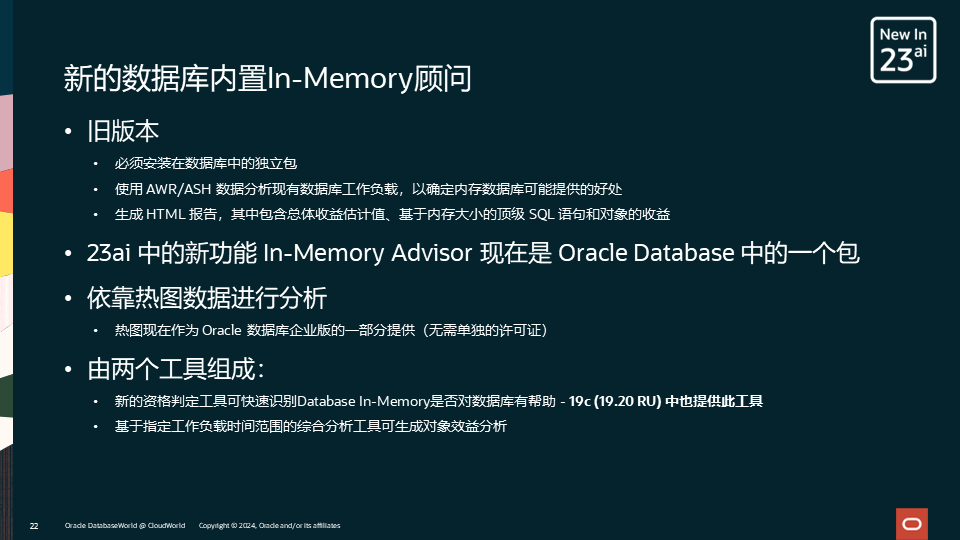 在23ai之前,In-Memory Advisor需要额外安装到数据库中,其可以判定工作负载是否适合于Database In-Memory。而在23ai中,数据库已经内置了In-Memory Advisor,因此使用更加方便。需要额外安装的版本仍然有用,例如可以安装到11g数据库中进行分析。