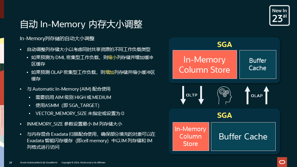 另一项增强是可以根据负载类型的变化(DML密集型还是OLAP密集型)自动调整行式内存(Buffer Cache)和列式内存(In-Memory Column Store)的大小。