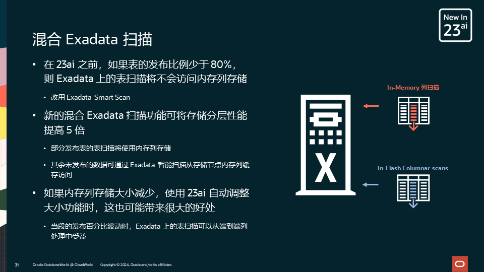 在21c中,Database In-Memory支持内存混合扫描功能,此项功能对于并非所有列发布到列式内存的情形也可以提速,这是从横向的维度。同样针对内存不足的情况,混合Exadata扫描可以综合内存和闪存中的列式数据进行分析提速。