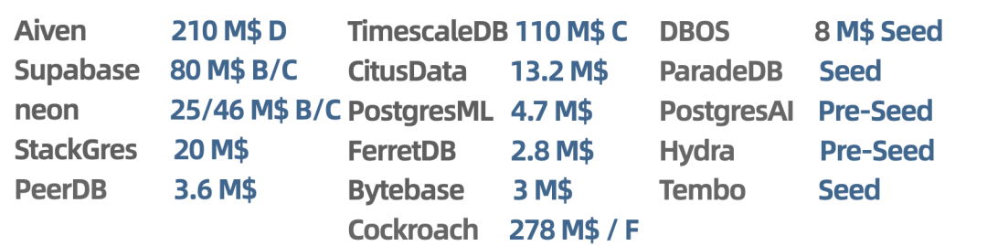 看看过去一年来数据库领域的融资纪录,不难发现几乎都是 PostgreSQL 生态的创业公司,以下是 PostgreSQL 生态或相关的公司最近的融资纪录。可以说,PG 生态几乎包揽了整个数据库世界的 New Money。