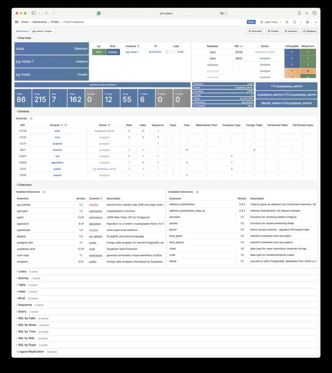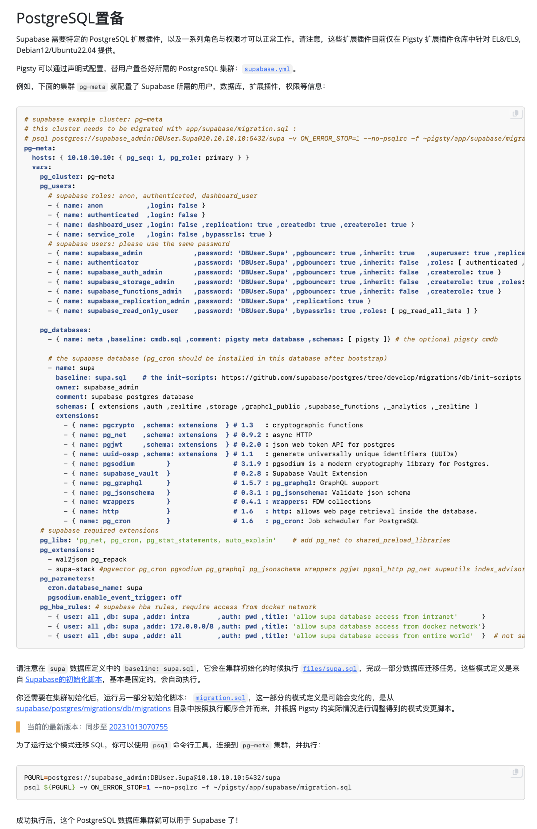 作为旨在整合 PostgreSQL 生态合力的创业项目,Pigsty 很早就关注到了 Supabase,并且深度整合了 Supabase 的扩展插件,允许用户在现有的高可用 PostgreSQL 集群上,运行自建/自托管的 Supabase 服务。