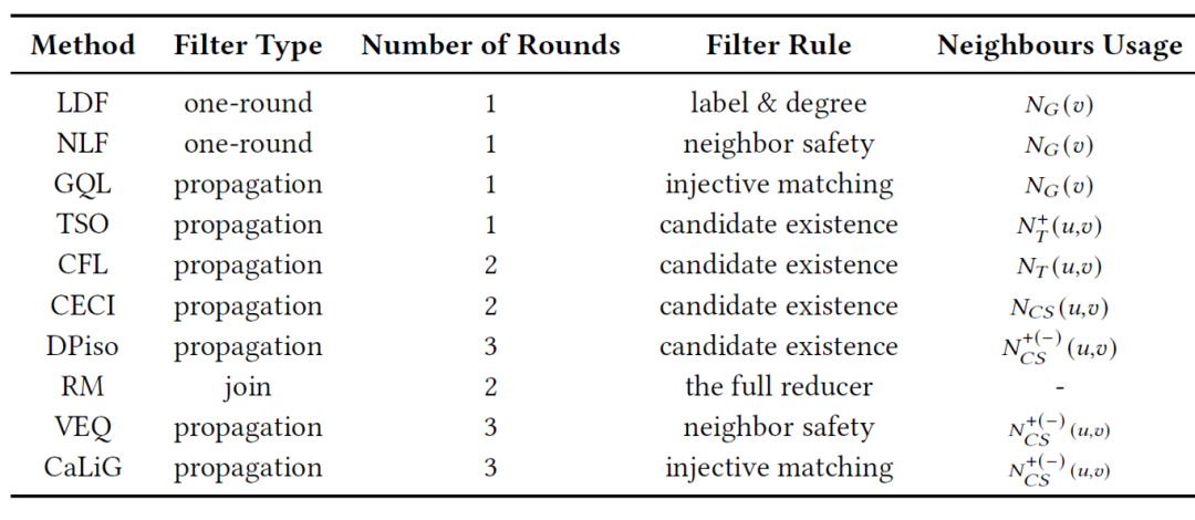 过滤策略用于判别每个查询顶点的候选顶点集,目的是可以提前过滤掉无效的候选顶点。在实践中,使用有效的过滤策略可以大大减少匹配数据顶点的数量。本文综述了10种具有代表性的过滤方法,具体如下表所示。