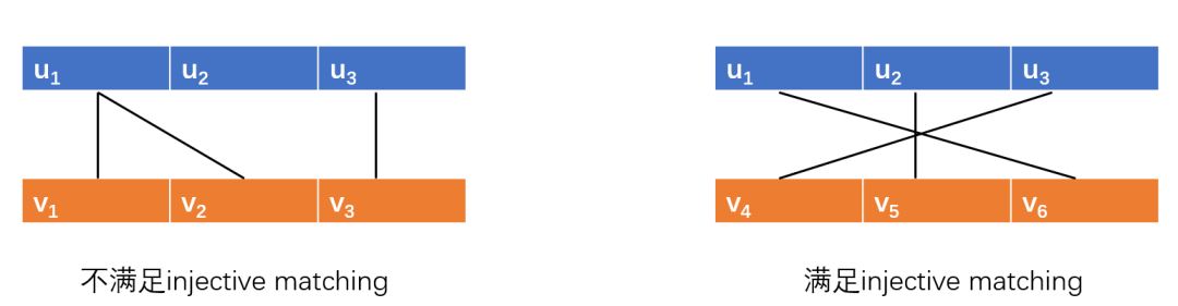 过滤规则3(Injective Matching):对于一个候选顶点集中的每个候选点,构造一个关于的邻居集和的邻居集的一个二部图。其中,对于和,如果,那么和之间就存在一条边。如果在这个二部图中没有单射匹配,那么可以从中过滤掉。