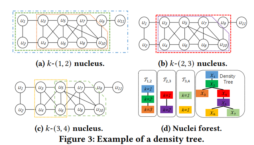与数据无关的匹配顺序仅利用查询图的信息来生成顺序,例如优先选择度数大的查询顶点。其中如下图所示,RM算法通过核分解为查询图构造了一棵密度树,并从最密集部分到最稀疏部分排列匹配顺序。与数据无关的顺序通常是经验有效的。