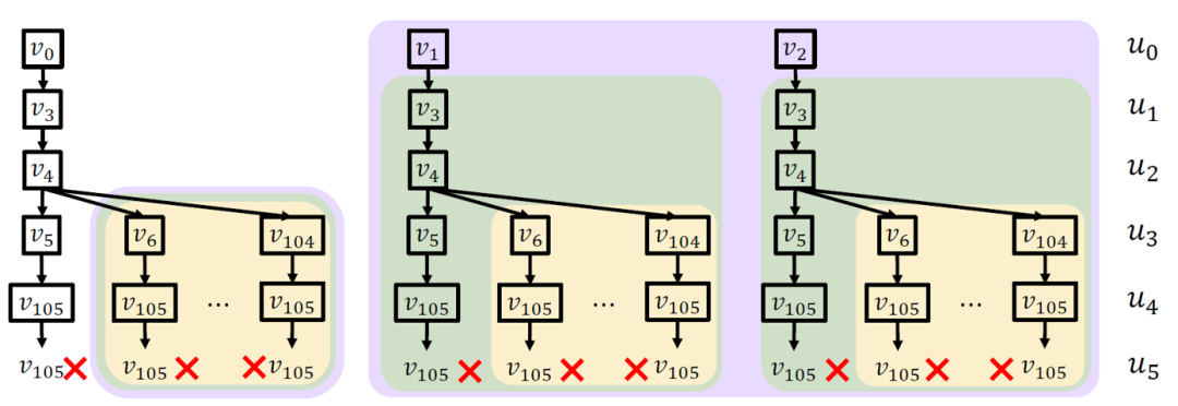 DPiso提出了失败集剪枝(Failing Set Pruning)策略,失败分为两种:conflict-class和emptyset-class,前者是同一个数据顶点被分配给多个查询顶点导致的,后者是一个查询顶点的局部候选集为空。DPiso通过BFS构建一个有根的有向无环图(DAG),用于捕获查询顶点之间的依赖关系。然后对于不存在依赖关系的顶点,它映射的顶点如果有一个是失败子树,那么它的兄弟顶点都将可以被剪枝。如下图最左侧的搜索子树所示: