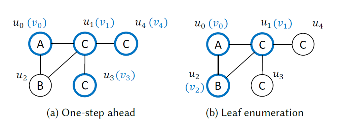 如上图所示,蓝色顶点表示已经匹配结束的顶点。对于One-step ahead方法,我们可以知道最后一个顶点不会再继续扩展下去,因此其得到的结果可以不展开,而是一次性作为多个嵌入一起枚举。对于Leaf enumeration方法,我们知道所有叶子节点都只有一个父节点,因此其得到的扩展结果也可以不继续展开,而是最后以笛卡尔积的方式计算最终的嵌入。