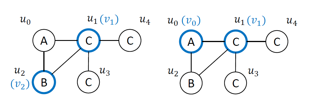 上述两种方式都只是对失败路径的剪枝,VEQ利用等价类的思想剪枝等价子树,不仅可以剪枝失败子树,也可以剪枝成功子树。VEQ会在候选集中定义动态等价类,如果中的两个数据顶点和在的所有邻居的候选集中都有公共邻居,那么它们是等价的。对于等价的数据顶点,它们的搜索子树具有相同的扩展过程。