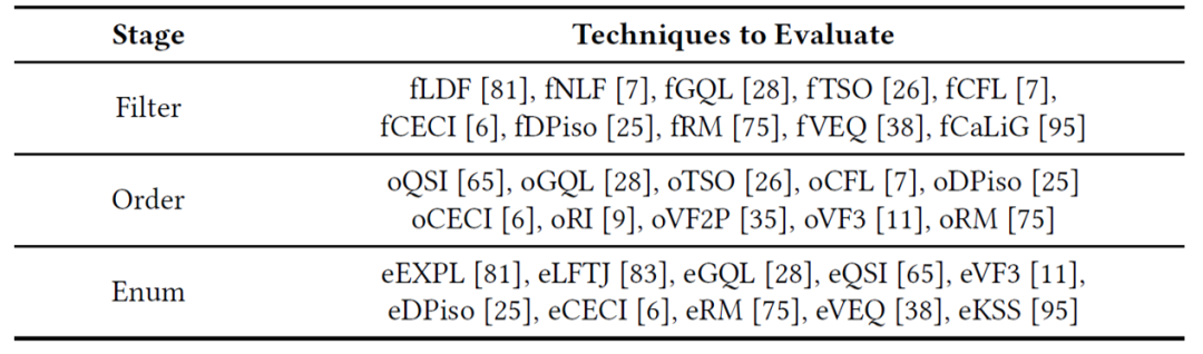 该综述将不同算法的不同优化方法分为了过滤策略、匹配顺序和枚举方法,如下表所示: