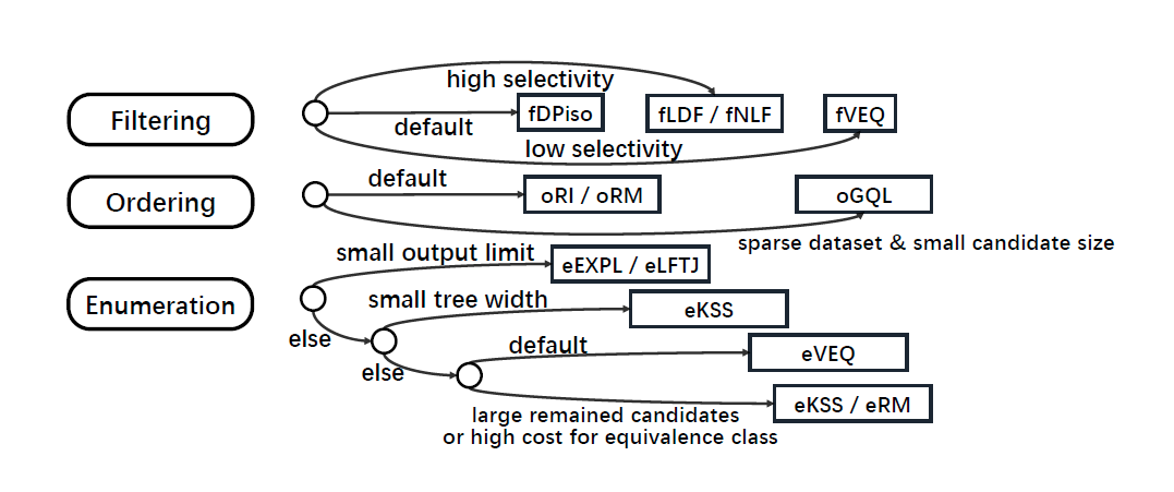 综述总结了近年来的子图匹配算法,通过对它们使用的优化策略的分析和在实际数据集下的实验,展现了不同算法在执行子图匹配任务时的性能表现。可以看出,每个算法的都在某个技术点上具有优势,没有一个算法可以完胜其余算法。最后,文章用下图来推荐不同算法的应用场景: