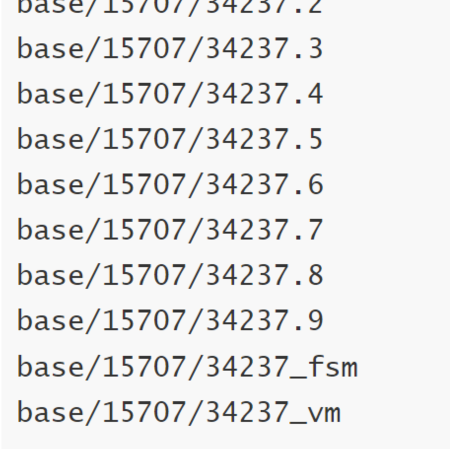 [root@xxxx]# du -sh base/*13M base/113M base/1570232G base/1570714M base/33539240K base/pgsql_tmp# openGauss每生成文件到1.1G,以此单位为一个段,再生成第二个文件,依此类推[root@xxxx]# du -sh base/15707/* | grep G1.1G base/15707/342371.1G base/15707/34237.11.1G base/15707/34237.101.1G base/15707/34237.111.1G base/15707/34237.121.1G base/15707/34237.131.1G base/15707/34237.141.1G base/15707/34237.21.1G base/15707/34237.31.1G base/15707/34237.41.1G base/15707/34237.51.1G base/15707/34237.61.1G base/15707/34237.71.1G base/15707/34237.81.1G base/15707/34237.94.0K base/15707/PG_VERSION