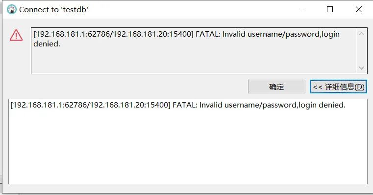 [192.168.181.1:62786/192.168.181.20:15400] FATAL: Invalid username/password,login denied.
