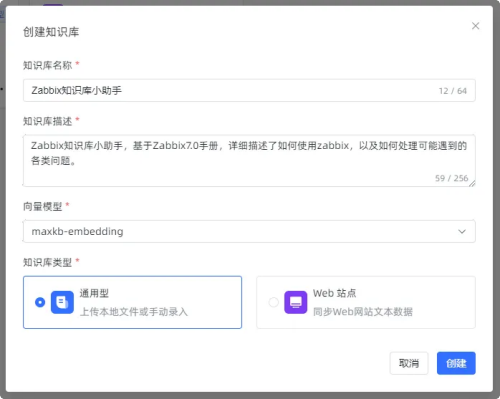 选择知识库-创建知识库,有两种类型可选,通⽤型可上传或⼿动录⼊⽂档,Web站点可以直接同步⽹站 ⽂本数据,本次上传本地Zabbix-7.0⼿册pdf⽂档,上传完后会⾃动进⾏索引并进⾏向量化处理,等待索 引完成即可。