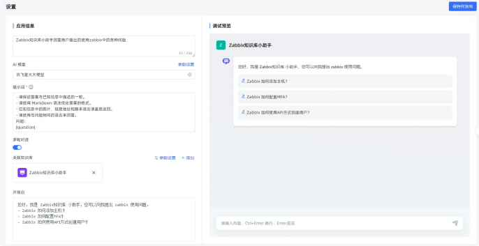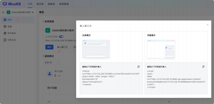 在Maxkb中找到应⽤-zabbix知识库⼩助⼿-概览-嵌⼊第三⽅