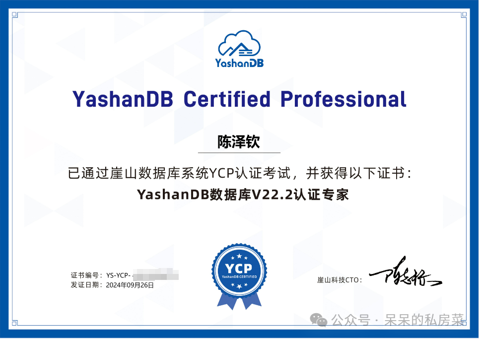上周末参加了崖山数据库举办的中级认证考试,今天就发证啦~