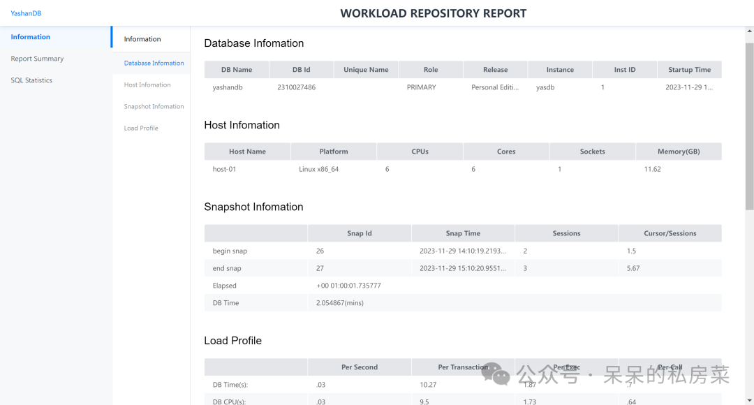 主要记录了数据库基本信息、数据库负载情况以及SQL执行情况。