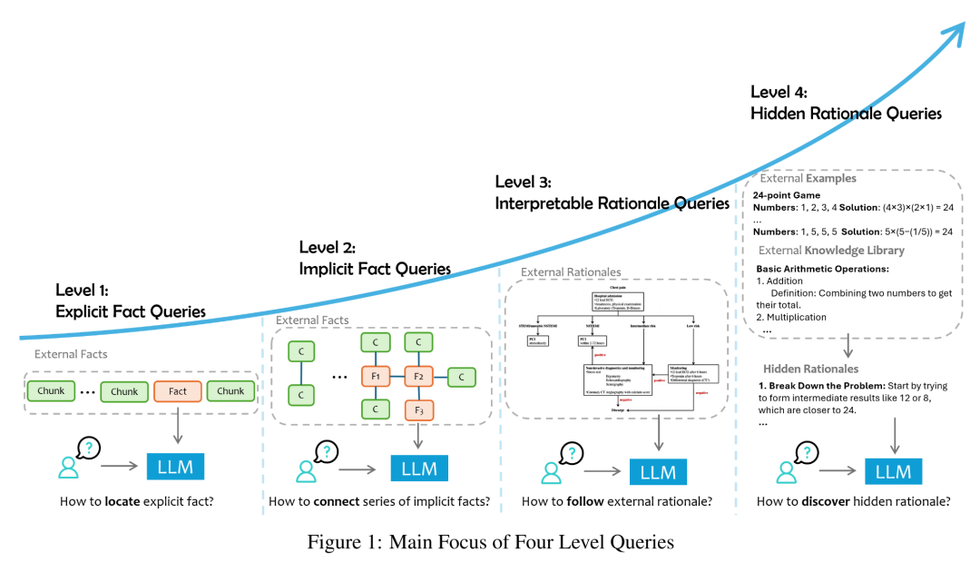 外部数据中直接存在的显性事实,不需要额外的推理。这是最简单的查询形式,模型的任务主要是定位并提取相关信息。例如,“2024 年夏季奥运会将在何处举办?”目标是外部数据中包含的一个事实。