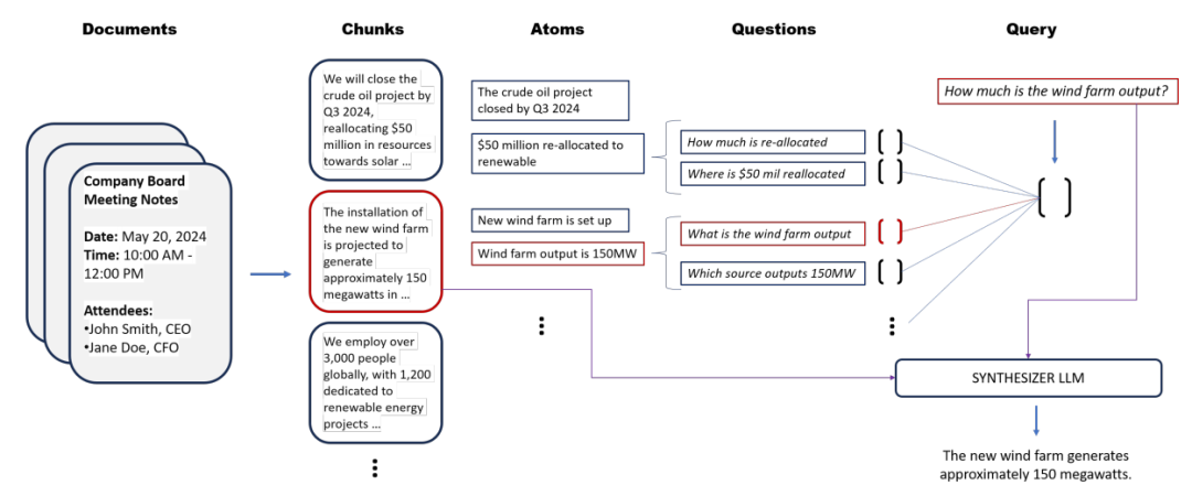 查询域对齐: 为每个文本的原子单元生成一组合成问题,将文本片段映射到查询空间,然后检索最接近原始查询的合成问题及其对应的文本片段。