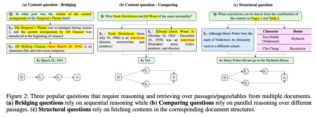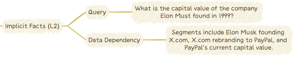 这些查询涉及数据中的隐性事实,这些事实并不直接显现,可能需要一定的常识推理或基本的逻辑推断。必要的信息可能分散在多个段落中,或需要简单的推论。例如,问题“堪培拉所在国家目前的多数党是什么?”可以通过将“堪培拉在澳大利亚”的事实与有关澳大利亚当前多数党的信息结合起来回答。