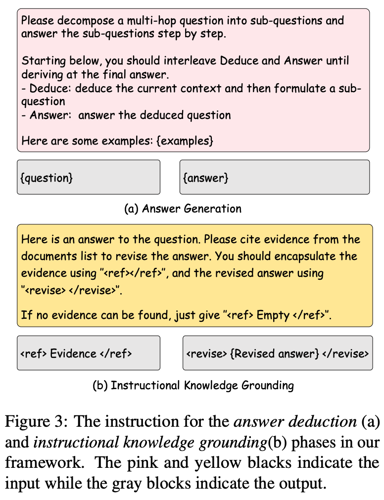 GenGround 使 LLM 在两个阶段间交替运行,直到得出最终答案:(1) 生成一个更简单的单步问题并给出直接答案,(2) 将问题-答案对追溯回检索到的文档,验证并纠正预测中的任何不准确性。此迭代过程确保了更可靠和准确的响应。