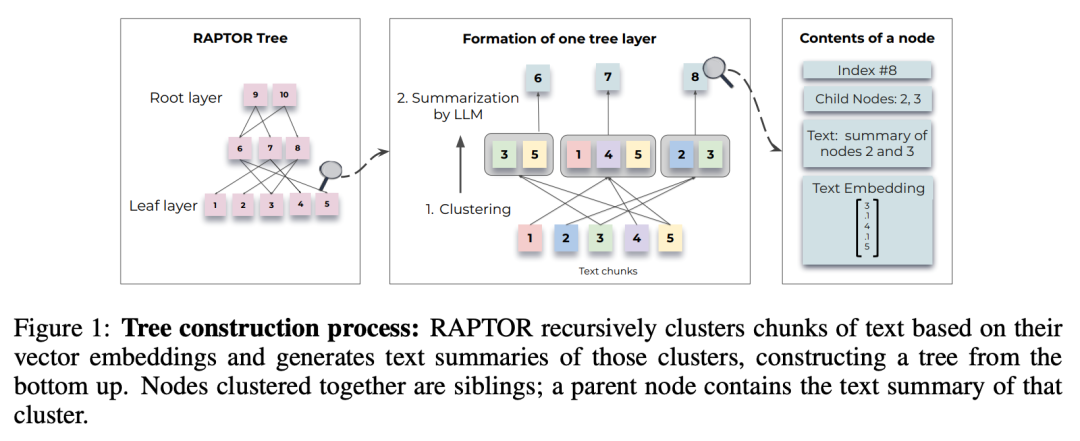 RAPTOR 使用聚类算法对最小粒度的文本块进行层次聚类,以捕捉文本块之间的高层次语义关系。它在每个层次上总结新的语义信息,并在节点的层次树中召回最必要的信息。