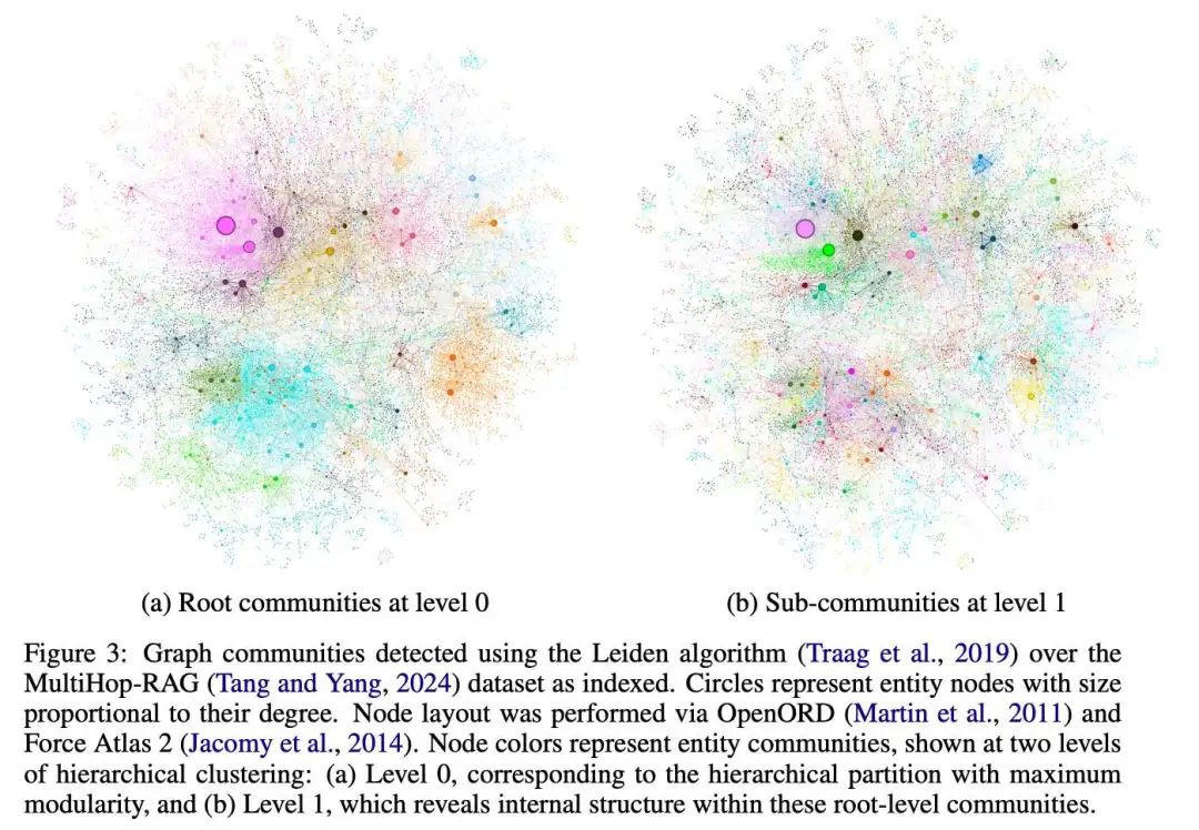 GraphRAG 也采用了聚类方法。它首先根据语义相似性连接最小的文本块,然后使用社区检测算法对节点进行分组。最后,通过分析每个节点社区内的响应,生成查询的全局答案。