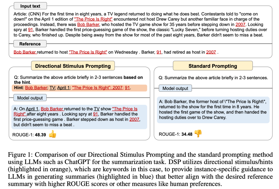 另一种创新策略是定向刺激提示(Directional Stimulus Prompting),通过下游任务的表现作为奖励机制,训练模型提取和利用定向刺激(即针对具体实例定制的特定线索或关键词)作为提示词,从而确保 LLMs 的行为与预期结果更加一致。