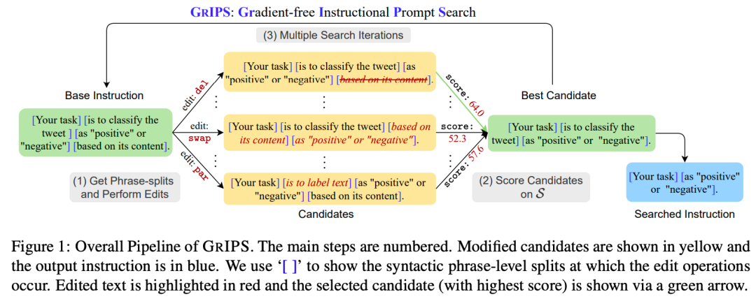 此外,针对离散提示词空间的优化,使用了基于编辑的方法,例如 GrIPS。这种技术使用一个小数据集作为评分集,通过实验对各种提示词修改(包括删除、交换、释义和添加)进行评分,以快速有效地确定最优提示词配置。