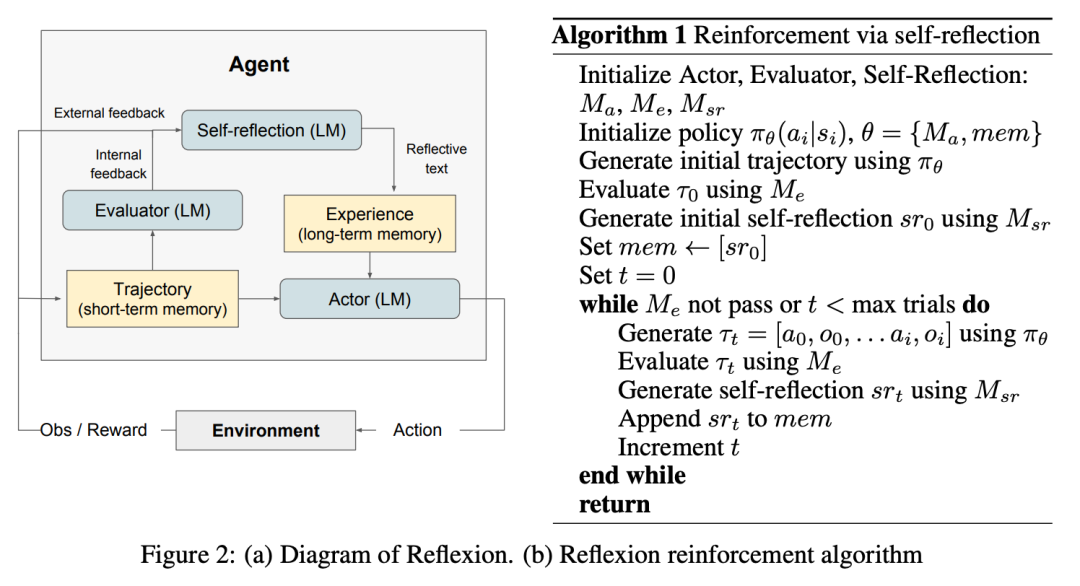 Reflexion 框架 引入了一种基于语言反馈的新型提示词优化方法,利用语言模型分析并将对 LLM 输出的反思存储在情景记忆缓冲区中。此记忆组件有助于改进未来互动中的决策过程,并利用累积的历史见解进行评估。