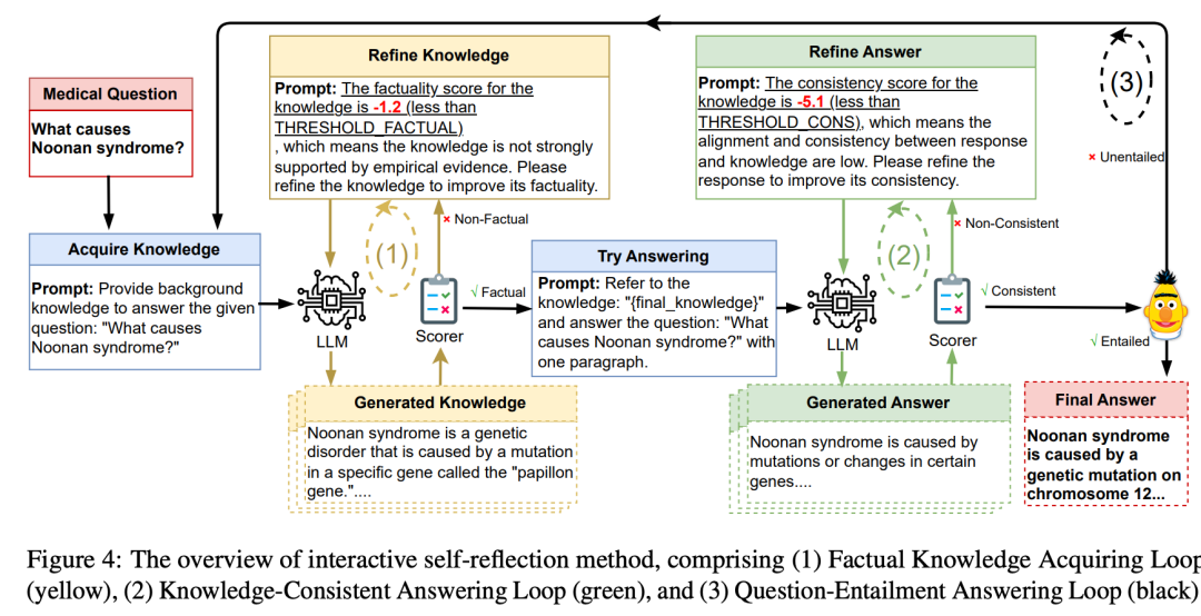 例如,Ji 等人(2023)提出了一种自我反思的方法,将知识获取与答案生成相结合。通过利用外部工具和设计提示词,他们构建了三种自我反思循环:事实知识获取循环、知识一致性回答循环和问题蕴含回答循环,从而将外部推理纳入模型的处理流程中。