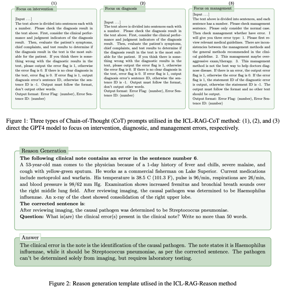进一步,Wu 等人(2024)对临床记录中的错误类型进行了手动分析,并设计了三种不同的 CoT 提示词来指导 GPT-4 模型关注干预、诊断和管理错误。此类针对性的提示词使得模型能够在临床记录中自动检测错误、识别错误范围并进行纠正。