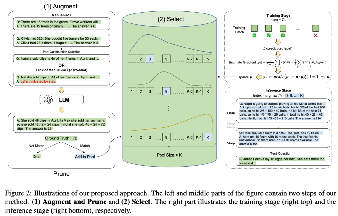 虽然手动设计的 CoT 提示词效果显著,但需要大量的人工和时间成本。为减少这些成本,Automate-CoT 提出了一种从标记较少的数据集中自动生成增强推理链的技术。该方法采用方差减少的策略梯度策略评估每个 CoT 链的重要性,帮助选择最有效的提示词组合。