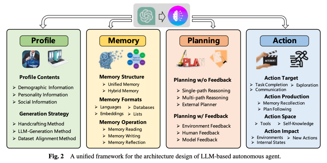 另一种使用思维链提示词的方法涉及围绕 LLMs 构建代理工作流系统。这通常需要开发一个更加全面的系统来应对各种现实场景。根据 Wang 等人的研究,此类系统通常可以分为概况、记忆、规划和行动模块。可解释的推理可以以不同形式集成到多个模块中,使代理能够根据环境或人类反馈进行适应和迭代。