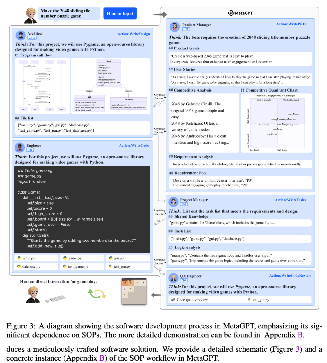 MetaGPT 开发了一个用于软件开发的多代理系统,在该系统中,项目中的不同利益相关者被表示为各自的代理。这个设置允许多个代理根据现实工作流程协同合作,有效完成软件开发任务。