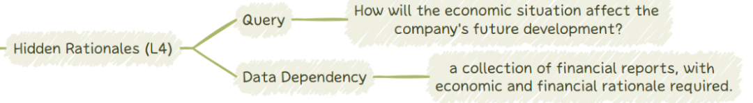 这一类查询涉及更具挑战性的领域,这些推理并未明确记录,而是必须从外部数据中观察到的模式和结果中推断出来。这里的隐性推理不仅指隐含的推理链和逻辑关系,还包括识别和提取每个特定查询所需的外部推理的内在挑战性任务。例如,在 IT 运维场景中,云运维团队可能已经处理了许多过去的事件,每个事件都有自己独特的情况和解决方案。LLM 必须能够从这些隐性知识库中挖掘出成功的策略和决策过程。同样,在软件开发中,先前调试过的错误历史可以提供大量隐性见解。虽然每个调试决策的逐步推理过程可能未被系统性地记录,但 LLM 必须能够提取出指导这些决策的基本原则。 通过综合这些隐性推理,LLM 不仅能够生成准确的回应,还能反映出由经验丰富的专业人员长期打磨的隐性专业知识和问题解决方法。