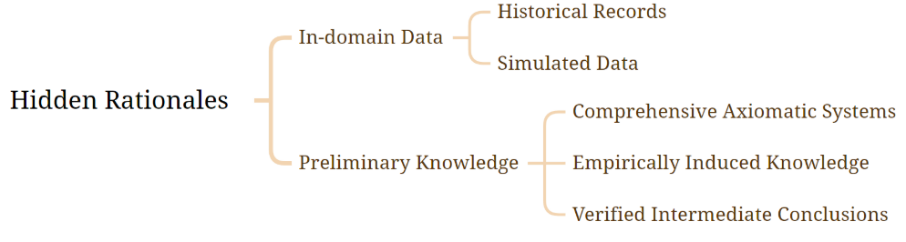 域内数据: 隐藏推理查询可能使用来自同一领域的数据,如历史问答记录或人工生成的数据。这些域内数据本身就包含了解决当前查询所需的推理技能或方法论。例如,在 Python 编程难题的背景下,历史问题的解决方案往往包含经典算法和问题解决策略,这些策略可以帮助解决当前的问题。 初步知识: 另一种隐藏推理形式是广泛分散的知识库,这些知识库在不同场景中应用各异。这种初步知识可能构成一个完整的公理系统,例如作为法律判决基础的本地法律法规。此外,它还可能包括在某些领域(如数学证明)中简化推理过程的已验证中间结论。在处理真实世界问题时,这些先验知识可能还来源于人类经验的复杂积累和经验总结。