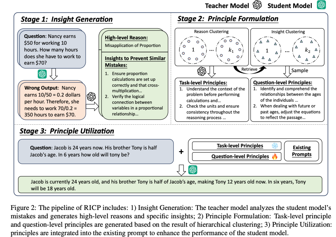 RICP 利用训练数据中的错误生成高级推理和具体见解,然后使用层次聚类对错误模式进行分组,生成任务级和问题级的原则,并将其结合起来以提供问题级见解。