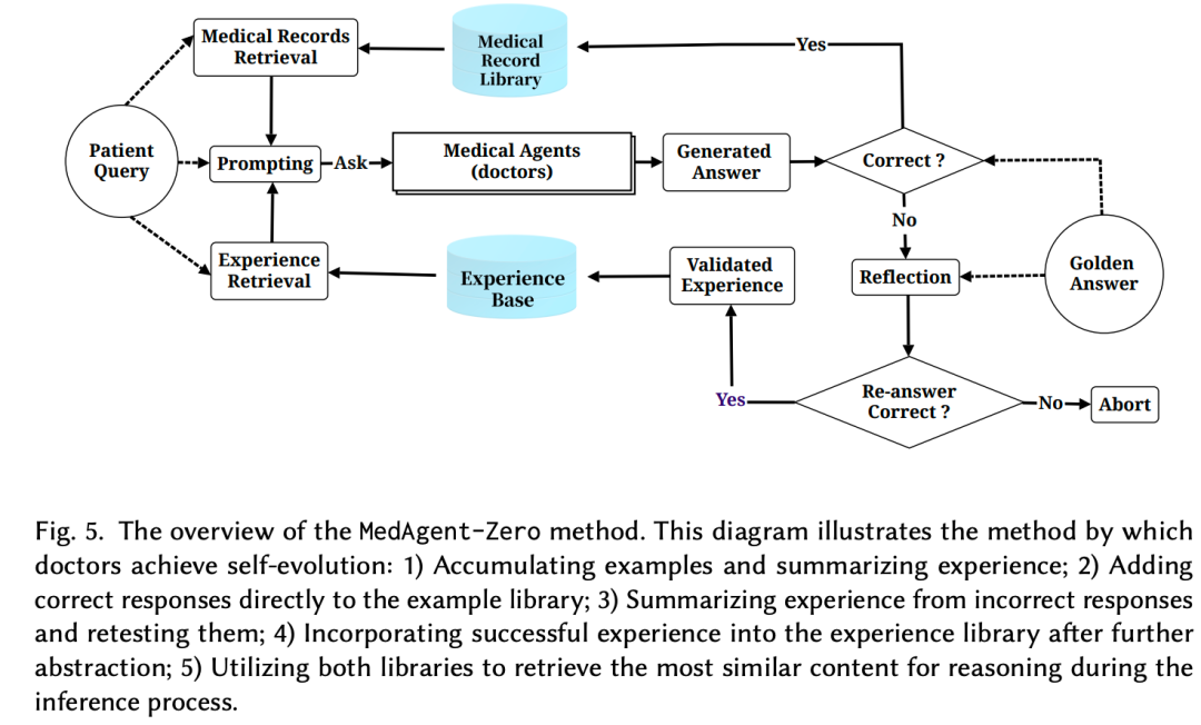Agent Hospital 通过反思生成理由,并在生成的数据上同时利用记录检索和经验检索。