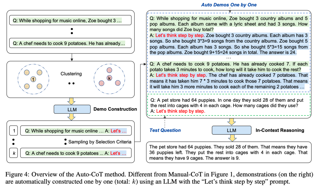此外,Zhang 等人 提出了 Auto-CoT 方法,将示例聚类为各种具有代表性的类型。通过多样化采样问题并生成推理链,该方法构建了更好支持学习过程的示例。