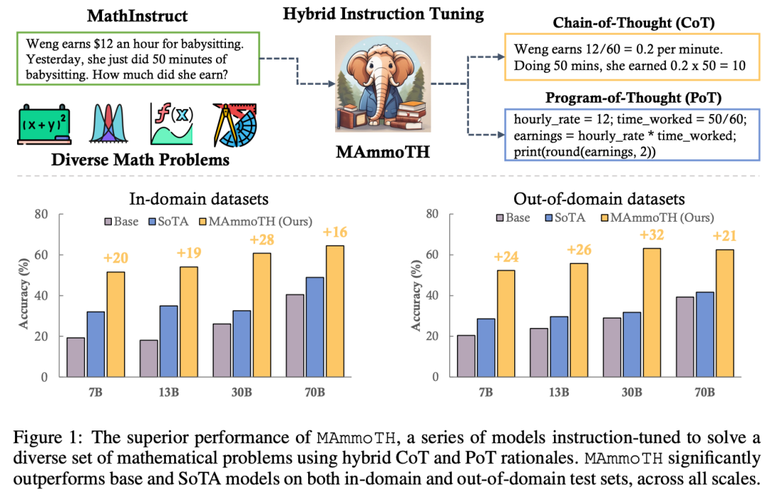 MAmmoTH 精心构建了一个结合了“思维链”(Chain of Thought)和“程序思维”(Program of Thought)推理的数学示例数据集,确保了不同数学领域的广泛覆盖,提升了LLM解决一般数学问题的能力。