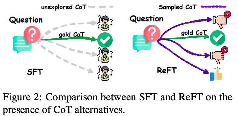 ReFT 提出了从多个对应同一问题的标注推理路径中学习的方法。它自动为给定的数学问题采样大量推理轨迹,利用正确答案生成奖励信号。