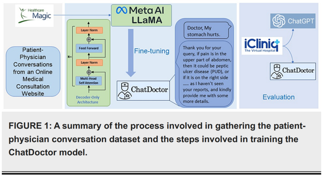 ChatDoctor 利用一个包含 100,000 条来自广泛使用的在线医疗咨询平台的医生-患者对话数据集,微调了 LLaMA,显著提升了模型理解患者需求并提供有效建议的能力。
