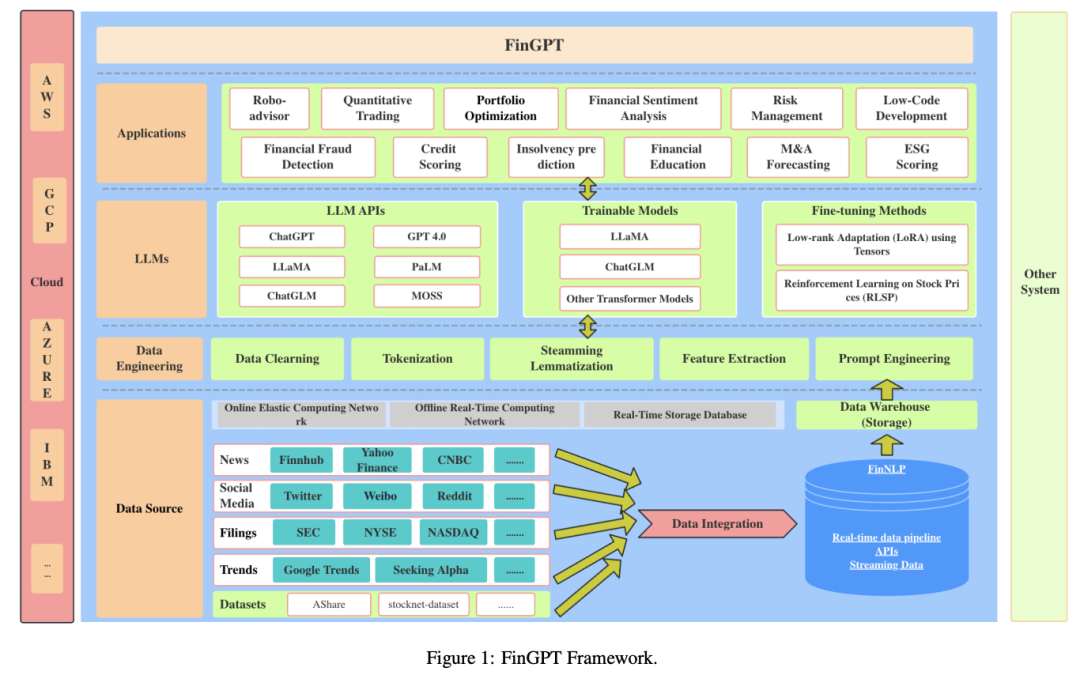 FinGPT 开发了一个基于金融数据进行微调的开源 LLM,使用自动化数据管理和轻量化的低秩适应技术。