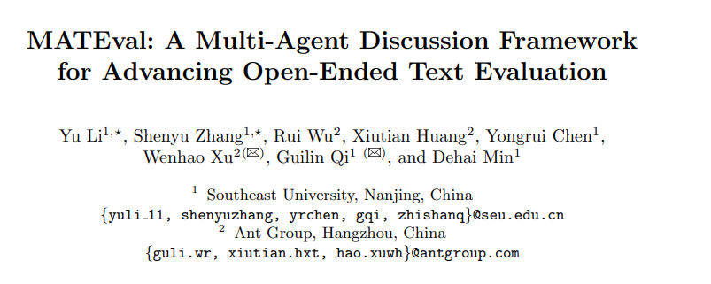 本文是由东南大学知识科学与工程实验室、杭州市蚂蚁集团联合发表。该文提出的 MATEval 框架通过模仿人类协作讨论的方式,整合多个代理互动来评估开放式文本。 MATEval: A Multi-Agent Discussion Framework for Advancing Open-Ended Text Evaluation