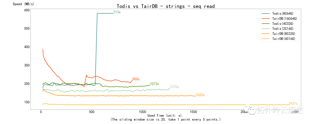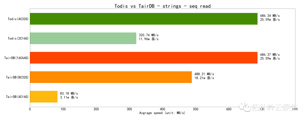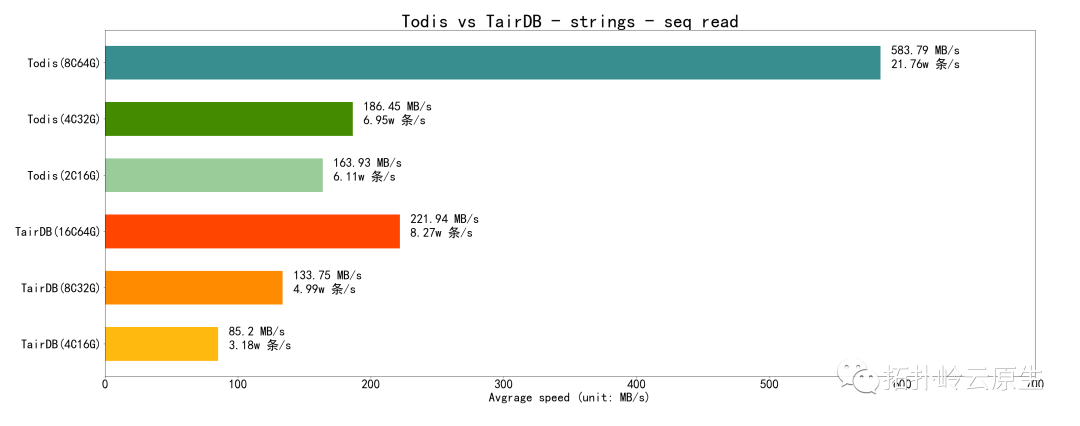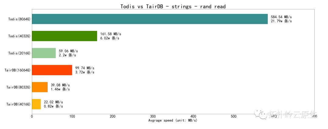 该对比测试中不包括 Todis 8C64G 的规格,因为 8C64G 可以将全部 109G 数据都装入内存(采用内存压缩技术),就没有必要进行此项对比了。