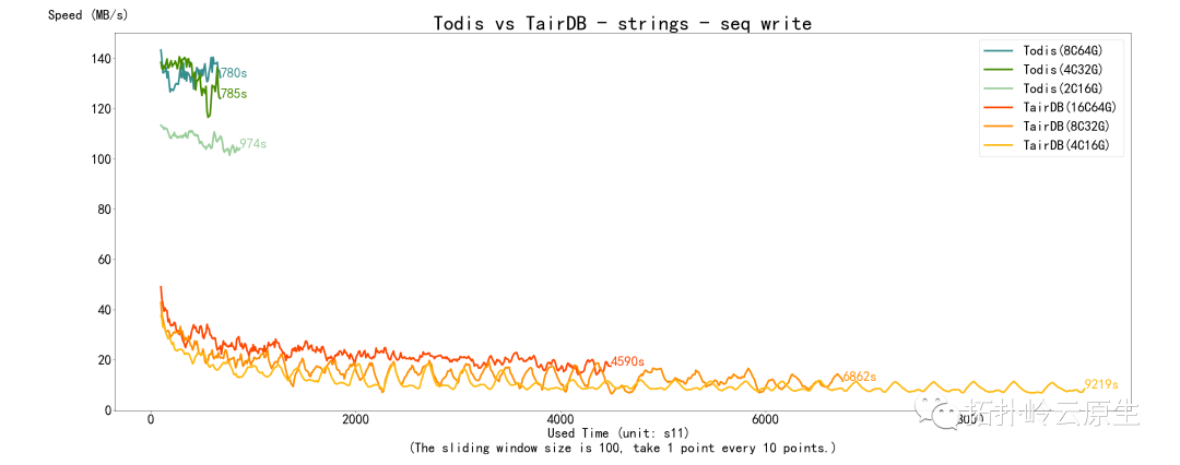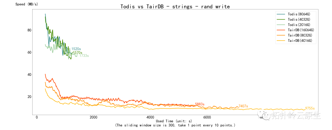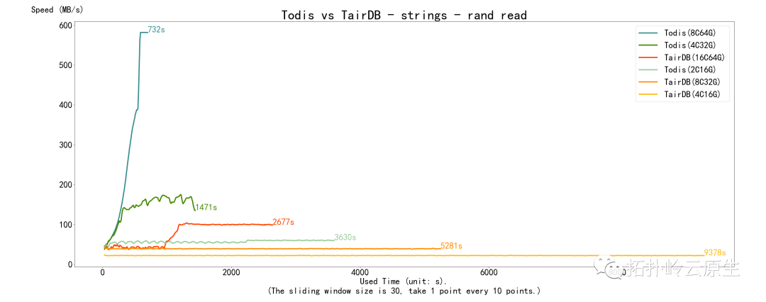 再看 随机读:图中 Todis 8C64G 的跳跃点在视觉上比顺序读要靠前很多,但其实也是在横轴 500 多秒处的(因为横坐标的最大值变大了 4 倍)。真正不同是其在跳跃点之前的部分相比顺序读是逐渐提高的,这是因为而数据总量有限,冷启动随机读的时候 Cache 命中率是由逐渐提高(一阶导数)的,并且随着 Cache 的填充,Cache 命中率提高的速度(二阶导数)也是逐渐加快的。