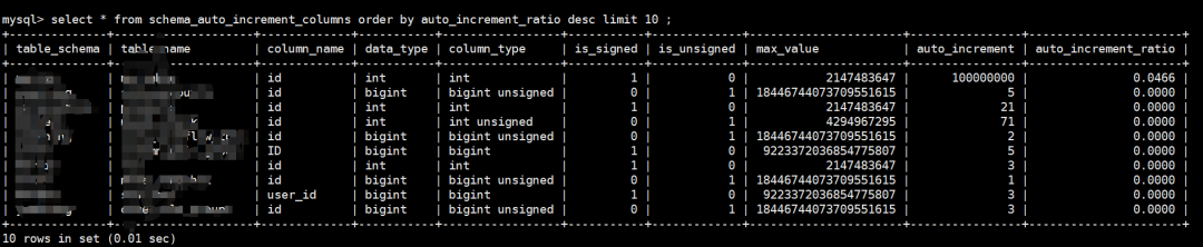 SELECT concat(table_schema, '.', table_name), round(auto_increment pow(2, 31) * 100, 2) AS 'auto_increment_usage'FROM information_schema.tablesWHERE table_schema NOT IN ('information_schema', 'mysql', 'performance_schema', 'sys')AND auto_increment IS NOT NULLORDER BY auto_increment_usage DESCLIMIT 10;
