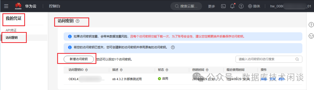 AK:Access Key ID,接入键标识,用户在OBS系统中的接入键标识,一个接入键标识唯一对应一个用户,一个用户可以同时拥有多个接入键标识。OBS系统通过接入键标识识别访问系统的用户。 SK:Secret Access Key,安全接入键,用户在OBS系统中的安全接入键,是用户访问OBS系统的密钥,用户根据安全接入键和请求头域生成鉴权信息。安全接入键和接入键标识一一对应。