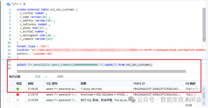 obclient [TPCH]> select count(*) from ext_obs_customer;select last_trace_id() from dual;