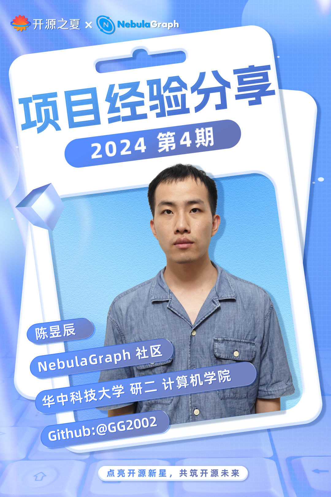 由于 NebulaGraph 目前还不支持插入 `Blob` 数据类型,因此这里不得不使用`字符串`类型+`Base64 编码` 做权宜之计。当然,负责人也表示 `Blob` 数据类型会在 NebulaGraph 之后的版本进行支持,到时候只需在 rust-nebula 里支持好这个数据类型,然后直接移除上方的 Base64 部分即可正常使用 OpenDAL 了。这里也有一个小插曲,笔者在两个月前就 fork 了 OpenDAL 的主仓库并在上面测试好了 NebulaGraph 的相关功能,结果同步主分支后,合并的时候一堆配置代码结构直接大改,甚至测试逻辑也改了,在此不得不感慨 OpenDAL 的更新速度之快。笔者也不得不直接放弃 merge,选择在同步完成后的主分支上进行功能添加。这一情况在 GSoC 上亦有体现,笔者需要吸取教训,以后要对某个自己很早之前就 fork 的项目提 PR 时,一定要先同步一下再改:(陈昱辰:Hello大家好,我是陈昱辰,目前在华中科技大学计算机系读研二。我本科是毕业于华科的数学系,因此我算是比较幸运的跨考成功的人。OSPP:你是什么时候开始接触、参与开源的?你对开源是如何理解的?陈昱辰:实际上,仅论接触开源项目并阅读代码,我在大二的时候就已经开始尝试去看一些二次元相关的开源代码了,比如 Artikash/Textractor: Extracts text from video games and visual novels. Highly extensible. (github.com) 这种项目,懂一点技术的二次元应该都知道这是干什么的。但是要说正式开始参与开源项目并贡献,我就是从今年年初开始的。起因仅仅是实验室不放实习,所以我希望找一些开源项目经历来充实我的简历。我认为我是以一种稍功利的心态来做开源的,因此我申请的都会是一些国内公司的开源项目,主要目的也是想尽可能为以后找工作套点近乎。我并不觉得这有什么不好的,虽然看到一些开源群的群友吐槽功利心跟开源冲突,但是在我眼里,开源这件事正是因为无论你是为爱发电也好,还是希望从中得利,只要你开源,那么社区都会欢迎你进行贡献,而你终将留下一些贡献(肯定还是要通过社区审核的)。开源社区正是因为它的包容性才得以蓬勃发展。OSPP:你在选择开源之夏项目时重点关注了 RUST 相关项目,为什么对 RUST 感兴趣?以及为什么选择该项目?陈昱辰:那么也要从我本科说起了,我从 php 一路学起,然后是 Javascript,Golang,中途看了点 Java 和 C++,我感受到假如我想深入了解系统原理并做一些 hack 的事情,C++ 几乎是必不可少的。因此我在去年开学的时候开始正式学习C++。这个时候问题就来了,我并非以计算机初学者的知识眼界去学习的 C++,我一开始就知道 Modern C++ 的好,我也理解很多语言的设计(它们大多会被拿来跟 C++ 比较)。但由于 C++ 的历史包袱过重,实现某种事情有相当多的写法(大家都知道这在以前甚至算 C++ 的优点),我杂乱的知识体系让我难以分清每种写法的存在必要性,Modern 的写法和传统写法日常在我脑子里打架,通常还伴随着各种从知乎“C++ 语言律师”那里看来的辩论,为了解决这些为什么,我通常要去追溯 C++ 每种写法的历史,然后简中互联网,尤其以百度+ CSDN 的组合拳,让我在搜索时看到那些一眼机翻的、没有任何格式可言的、转载标原创的文章时,头疼都会更加的剧烈。 所以我受不了了,开始学 Rust。第一点肯定是这门语言相当受知乎的“语言律师”们的赞赏,与 Rust 编译器搏斗这件事相当闻名;第二点则是即使使用百度搜索 Rust 相关内容,你搜出来的也基本上不会有什么太劣质的内容,这一点是因为我感觉会 Rust 的人多少都沾点技术至上主义和强迫症,他们写的东西注定水不到哪去;第三点也是最重要的一点,Rust 编译器能教会我写 C++,大家都说 Rust 是一批很会写 C++ 的人,因为受不了 C++ 兼容 C 的那部分以及各种老旧的阻碍工程合作的设计而写出来的,不谈 Rust 与 C++ 的各种鸡毛蒜皮的争端,可以肯定的是写 Rust 的人肯定比我懂 C++,Rust 编译器试图教我写的代码肯定比我自己想出来的代码更安全更合理。 而当我再次报名某数据库比赛时,看着代码内部到处乱飘的引用和裸指针,去年我还浑然不觉,现在的我竟然感到了一丝烫手,这就是后话了:) 那么为什么选择这个项目呢,Rust 肯定是首位的,我本来是想找一些改数据库内核的项目做的,但是其他项目基本上都是 C++,少数是 Golang,然后我点进 NebulaGraph 看到了 Rust 技术栈,啪地一下就选好了。当然这个项目后面我了解到不是改内核的有些小失望,但是能写 Rust 就很不错了,更不要说 OpenDAL 中涉及到的异步编程与多语言交互也是我感兴趣的子领域。OSPP:有什么项目开发过程相关的经验可以分享给开源之夏的参与者们?陈昱辰:在项目过程中要多沟通交流,这一点需要多强调。比如我习惯于写代码多于交流,在我调研 NebulaGraph 的 Rust 客户端的过程中,决定要不要重写这个客户端我是想了很多遍的,我最主要担心的就是 NebulaGraph 社区愿不愿意让我重写以及后续维护的各种事项(是的,我就是不交流但是会胡思乱想的人),但是在跟我导师 Suyan 以及 NebulaGraph社区的 wey-gu 开始交流后,我基本上就没有再担心过这方面的事了,wey-gu 相当地热情,表示我怎么 comfortable 就怎么来就好。在与社区交流的过程中,我感受到大家都是很乐意帮助我的,在一些问题上也给了我充分的选择权,这让我的开发过程相当顺畅(但是因为没有 Review,我是比较担心我的代码质量的,尤其是在经过了 GSoC 项目的拷打之后)。还有一件有意思的事,我基本上