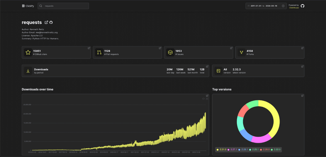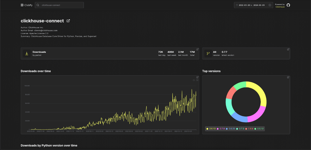 今年早些时候,我们推出了 ClickPy——一个简单的实时仪表板,用户可以查看 Python 包的下载统计信息。这个应用程序基于 PyPI 数据,每发生一次 Python 包下载就会在 ClickHouse 中生成一行记录!每次您运行 pip install,ClickHouse 就会收到一行数据!